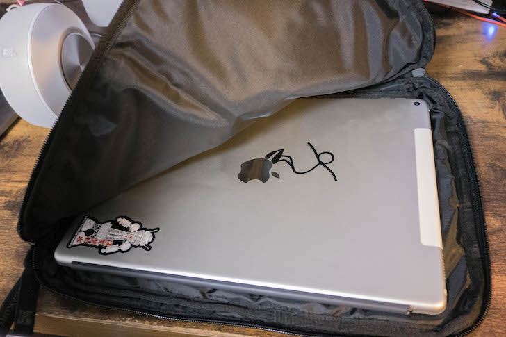 ▲Lサイズを購入したので、13インチのパソコンまで入るようになっています。(写真は、iPad12.9インチ)